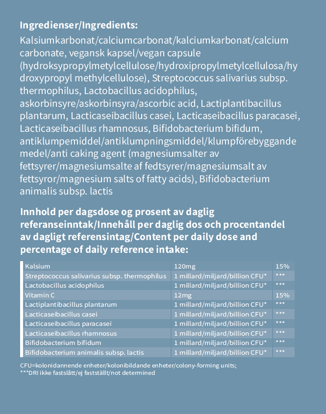 Våra mjölksyrabakterier skyddas av en unik kapselteknologi. Vi rekommenderar att förvara produkten i en temperatur mellan 10 – 25 C.